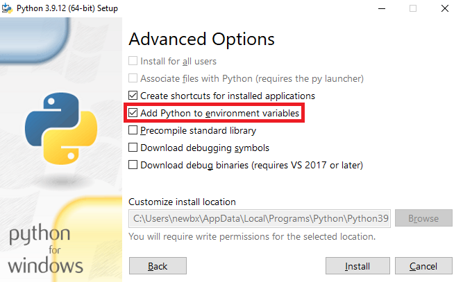 WARNING : Don’t forget the select Add Python 3.X to PATH on the first page !